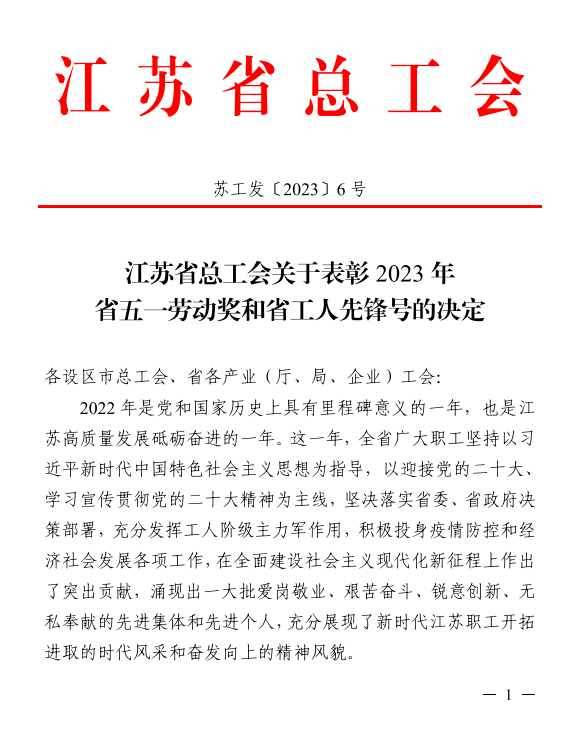“江苏省五一劳动奖状”是江苏省工会系统设立的最高荣誉称号,旨在表彰在中国特色社会主义建设中做出突出贡献的劳动者和企事业单位、机关团体。